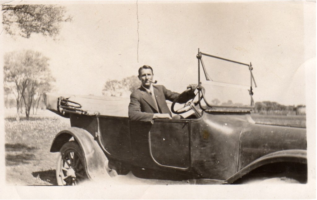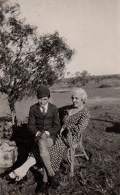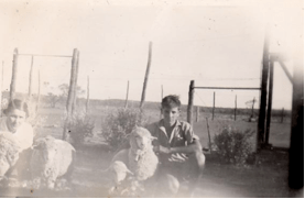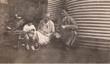 David (about 3) with Rachel and Russell (and puppy) in front of the bathroom and rainwater tank at North Boodanoo. The tricycle preceded a pedal car.