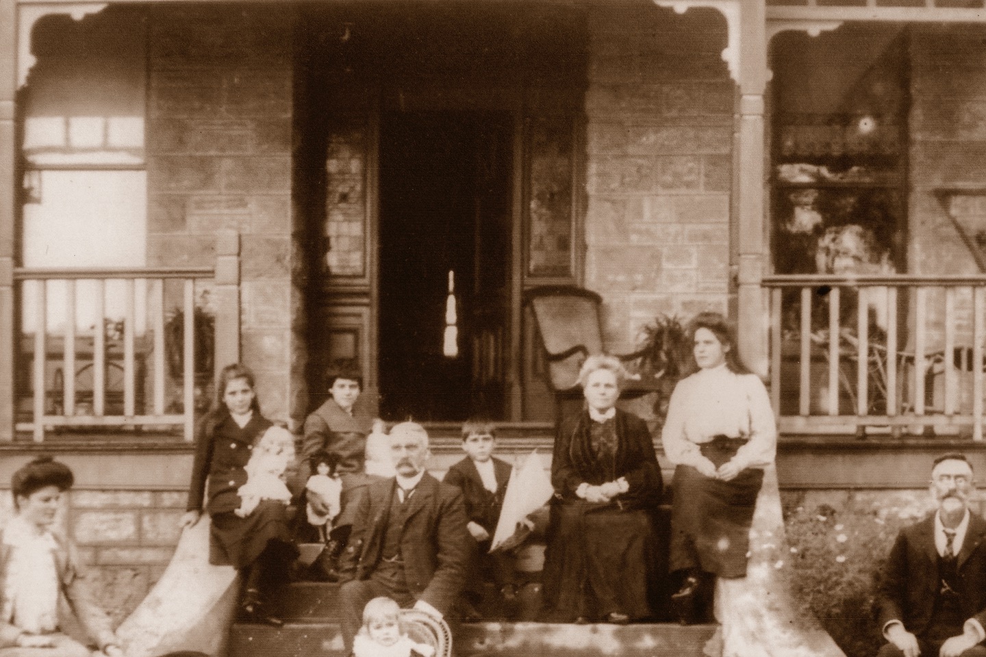 Percy Family circa 1899, 8 The Esplanade Peppermint Grove. Left to right: Amy, Evie, Rachel (with two dolls), J.B. Percy, Reg (in pram), Lilla, Edward Holbrook (J.B’s half brother). This residence was apparently rented while their new home was built.